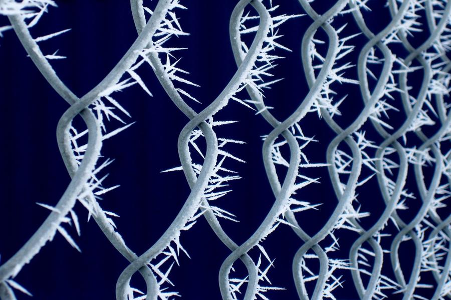 Read moreAn extraordinary display of spring frost covering everything in sight. This particular image of a frosted fence with a backdrop of a blue metal dumpster from a construction site was taken in late-March of 2011. #