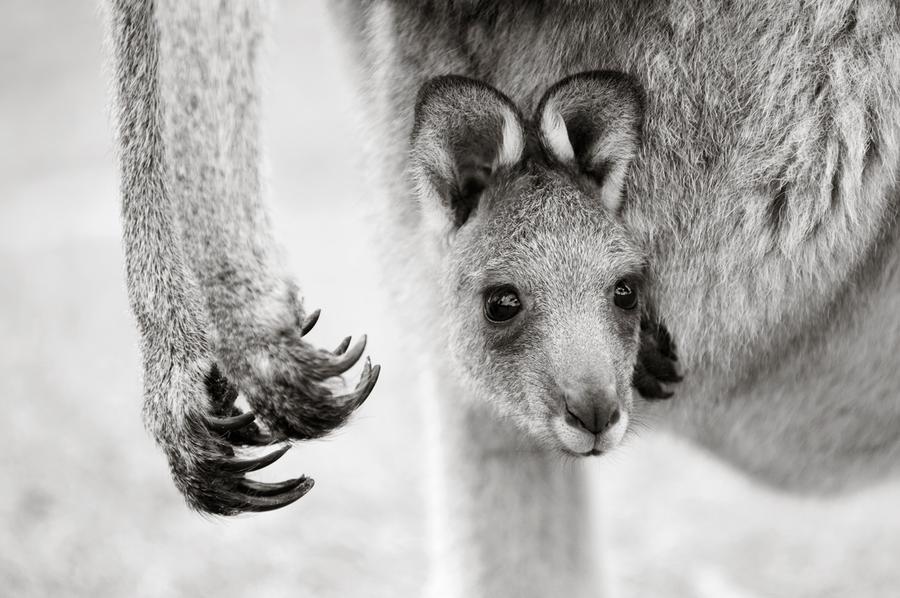 Read moreA "joey" (baby) Eastern Grey Kangaroo pokes a head out from its mother's pouch. The baby kangaroo will continue to peek until if feels safe enough to emerge for short periods. After 7 to 10 months it will leave the pouch for the last time. #