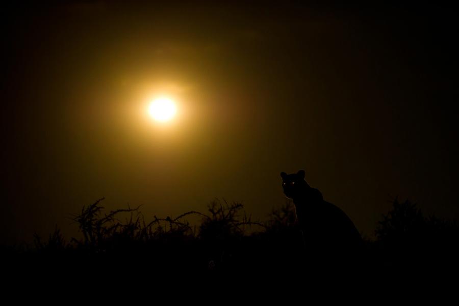 Read moreI have been trying to follow a leopard with cubs for the last year, and spend a lot of nights with them. She has no tracking device, so when I find her I try to stay with her as long as possible. On this particular evening a brown hyena stole her kill (a springbok ) and was sitting on a rock ledge with the moon rising behind her. I lit her eyes up with a torch to make it a bit more mysterious. #