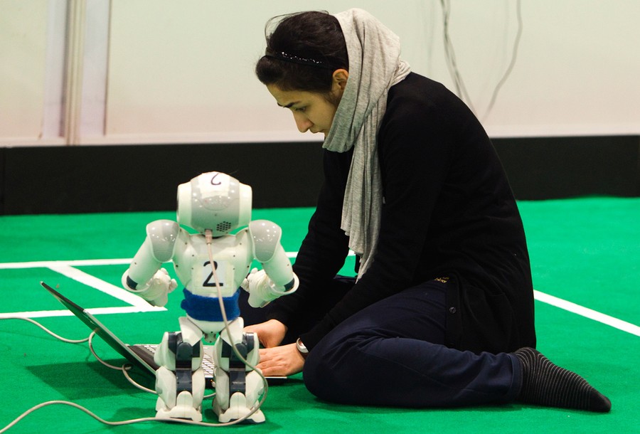 Read moreTuche Ayar, a member of the Cerbrus Turkish robotic team, prepares her robot before a soccer match during the 6th RoboCup Iran Open 2011 Competitions soccer match in Tehran, on April 7, 2011. #