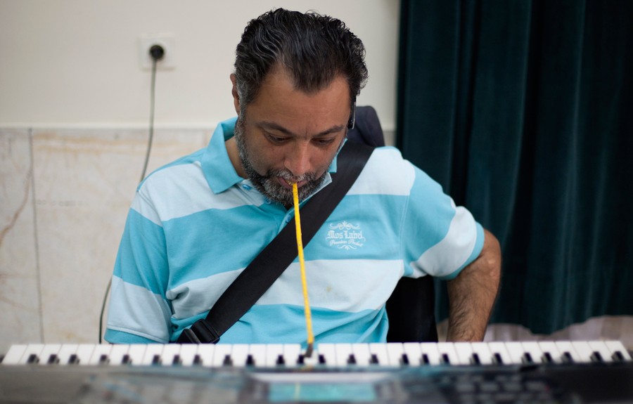Read moreShahram Khodaie, a disabled Iranian, tries to play the keyboard by using a tool with his mouth during a music therapy session at the Kahrizak nursing home, in southern Tehran, on June 25, 2011. Picture taken June 25, 2011. #