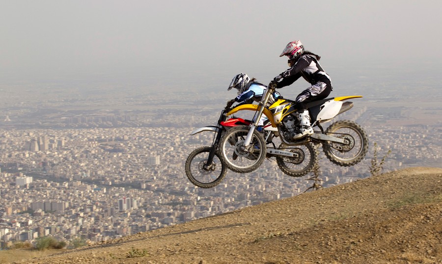 Read moreNoora (right) and Shahrzad Naraghi practice on a motocross track in the mountains overlooking Tehran, on July 3, 2011. Shahrzad Naraghi started riding motocross eight years ago to spend more time with her daughter Noora who became interested in the sport after watching her father compete in races, and began riding motorcycles at the age of four. The pair raced against each other at first and in women's only motocross races in Iran in 2009. In 2010, Noora travelled to the United States, completed training courses and raced in competitions sponsored by the American Motorcyclist Association. Women are banned from driving motorcycles on the streets of Iran. #