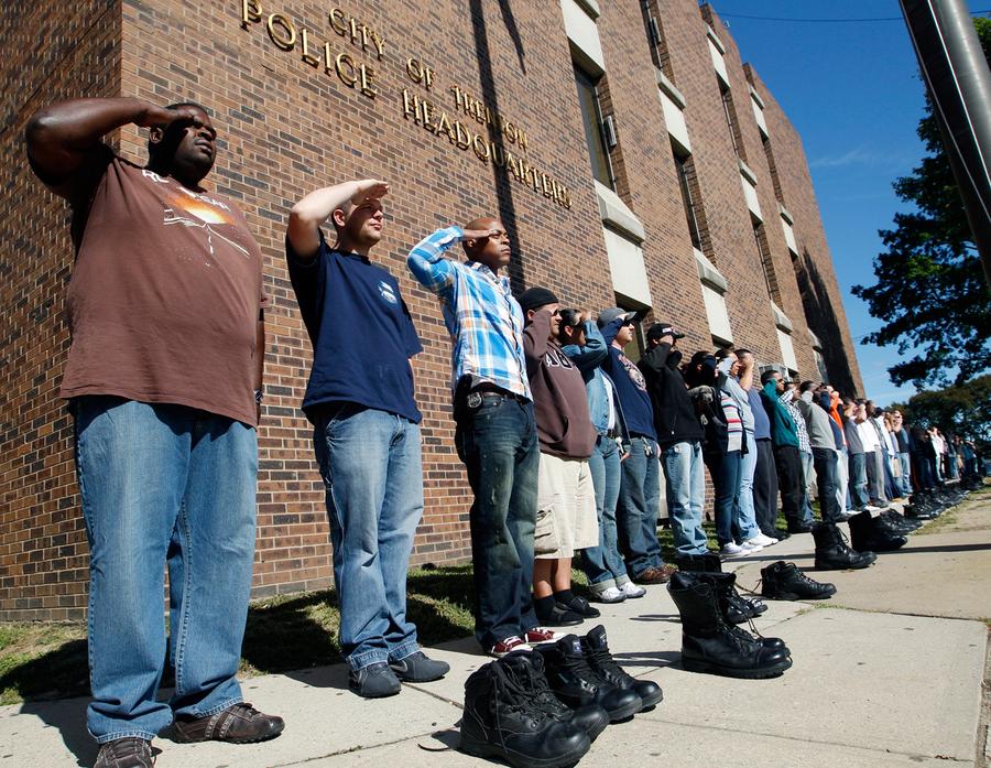 Read moreTrenton police officers salute on Friday, September 16, 2011, in Trenton, New Jersey, after they lined up their police boots after being laid off by the city. Trenton was the latest big New Jersey city to go through deep cuts to its police force. More than 100 officers were laid off. #