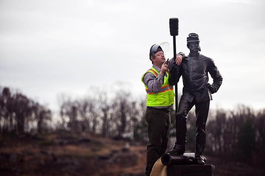 Read moreNational Park Service employee Brian Griffin works on the newly restored bronze figure on top of the 4th New York Artillery Monument, on November 28, 2011 in the Devil's Den area of Gettysburg National Park, Gettysburg, Pennsylvania. The statue had been pulled from its stone pedestal in 2006 and dragged more than 150 feet, the cost of the damage was about $50,000. The vandals were never found despite the offering of a $30,000 reward. #