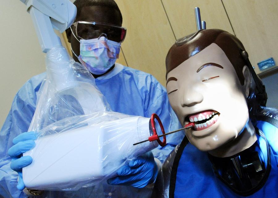 Read moreDental assistant student Travis Bell, 32, of Randolph, Massachusetts, practices taking an X-ray on Dexter the dummy during a lab in a diagnostic assisting class at Kaplan Career Institute, on September 4, 2009 in Boston. Bell was laid off from a car part manufacturer and is now collecting unemployment while he takes classes in dental assisting. The teeth in the dummy are real human teeth. #
