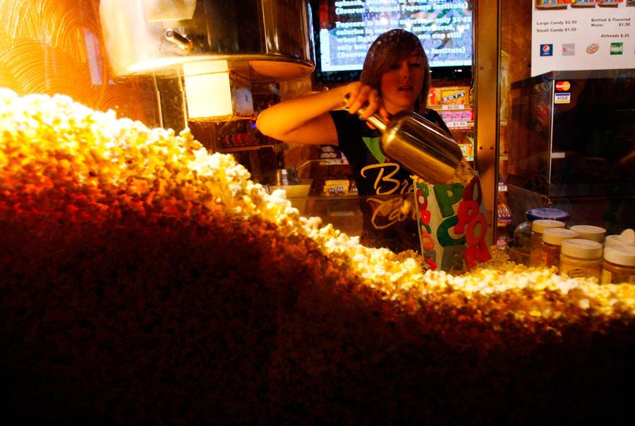 Read moreCailynn Williams, 17, fills a bag of popcorn for a customer at the New Strand Theater in West Liberty, Iowa, on July 8, 2011. Todd Leach, who owns the New Strand Theater, says that ticket sales were down from last summer due to the economy. #