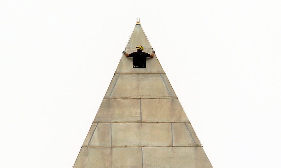 Read moreA worker prepares rappelling lines at the top of the Washington Monument as inspections to the earthquake-damaged structure began on September 27, 2011. Engineers rappelled down the 555-foot (170-meter) Washington Monument to assess damage from a rare 5.8-magnitude earthquake and storms that struck the U.S. capital in August. #