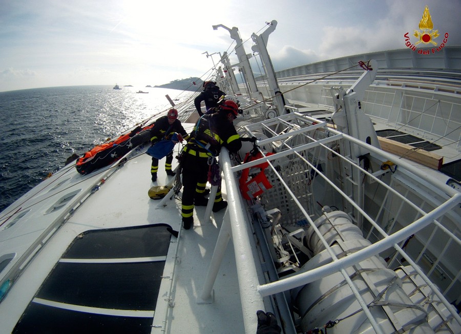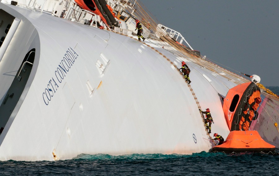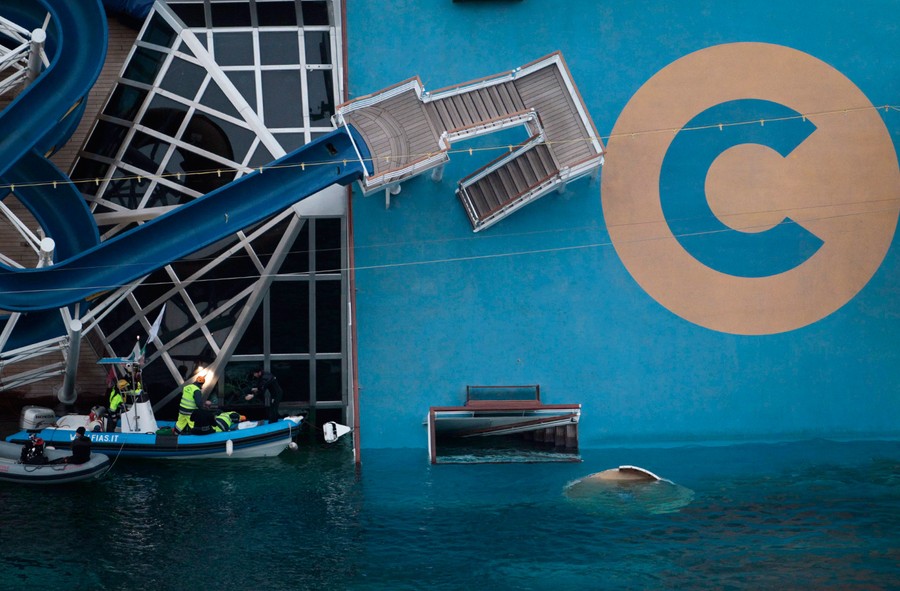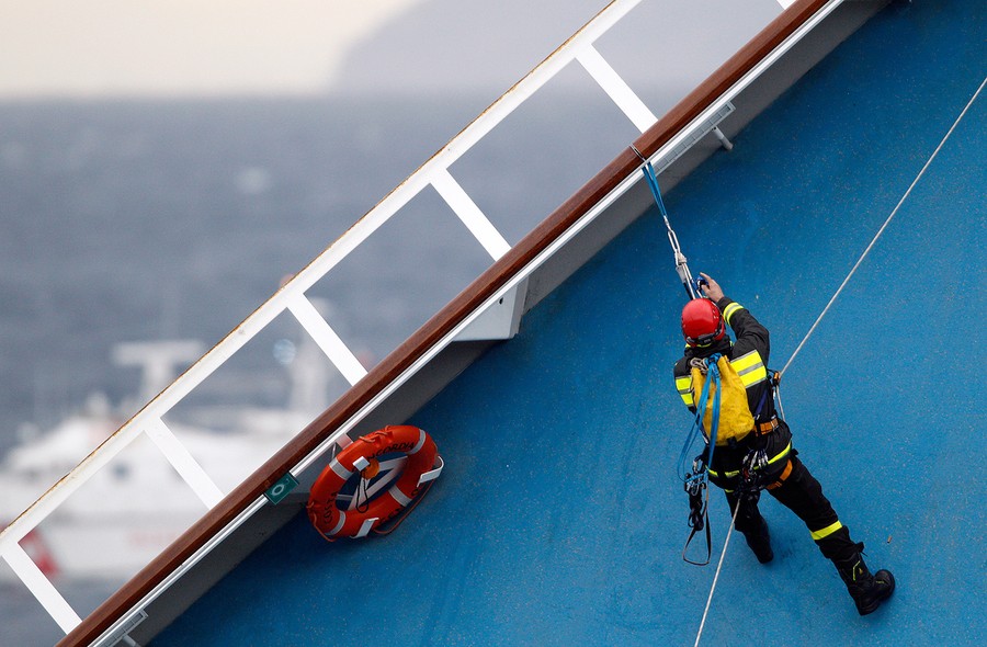 One week ago the cruise ship Costa Concordia ran aground off Isola del Giglio, Italy. Of the more than 4,200 aboard, 11 have been confirmed dead, 21 remain missing, and hopes of finding any more survivors are fading quickly. Rescue operations were called off earlier today amid fears the ship could quickly slip and sink deeper during worsening weather conditions. Captain Francesco Schettino remains under house arrest as investigators work to determine exactly what happened, and who was at fault. Rescue workers have spent the past seven days rappelling from helicopters, scaling the hull, scrambling inside and diving beneath the wreckage, racing against the clock to find anyone alive inside the massive wreck.