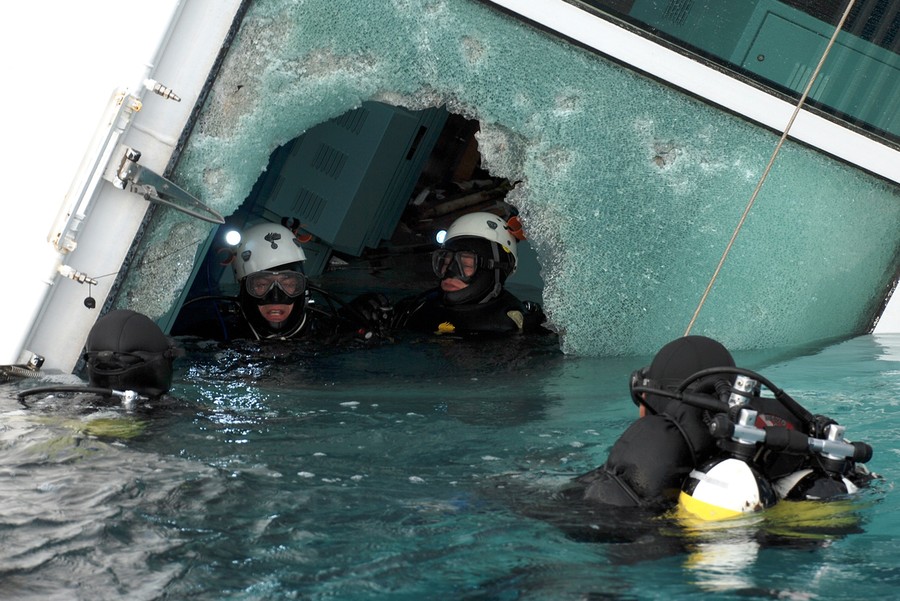 Read moreRescue divers inspect the Costa Concordia, on January 17, 2012. Rescue squads used controlled explosions on Tuesday to enter the stricken Italian cruise liner in the increasingly despairing hunt for survivors. #