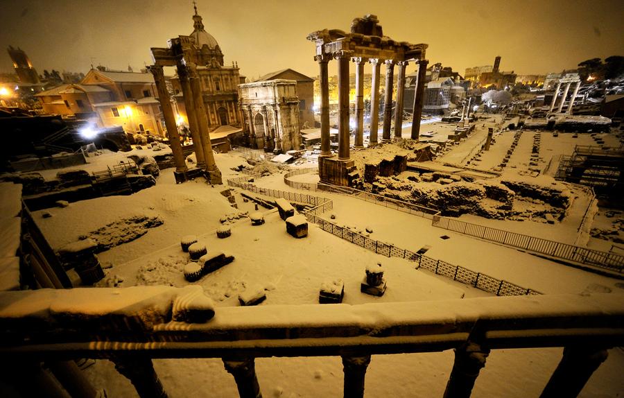 Read moreThe ancient Roman forum, after a snowfall, on February 4, 2012. A rare mantle of snow blanketed the historic center of Rome on February 3, forcing the closure of schools and tourist sites such as the Colosseum. #