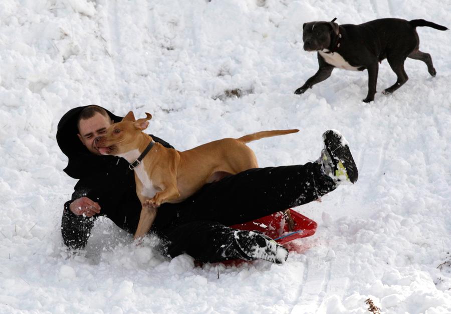 Read moreA man is knocked off his toboggan by a dog in Newtown Linford, England, on February 5, 2012. Heavy snow fell in some areas of Britain overnight, causing road closures and flight cancellations, and the Met Office warned of icy conditions, local media reported. #