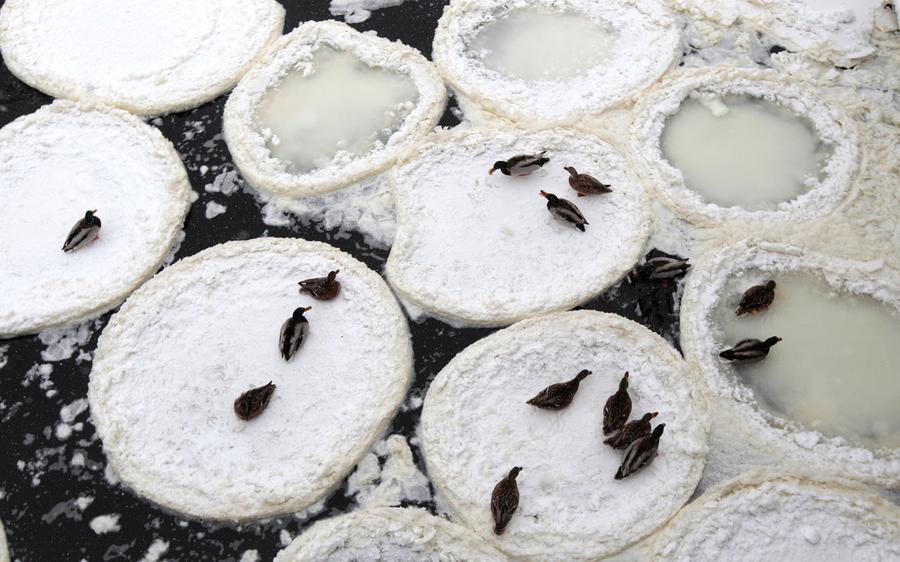 Read moreDucks rest on the ice in Svisloch river in a park in central Minsk, on February 4, 2012. Unusually cold weather of -24 Celsius (-13 degree F) hit the Belarussian capital on Saturday, according local media. #