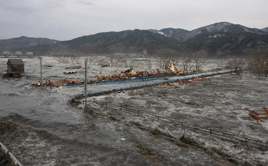 Read moreTsunami waves overflow a barrier in Miyako, Iwate Prefecture, northeastern Japan on March 11, 2011, the same scene visible on February 17, 2012 (click to view). [click image to view transition - javascript required] #