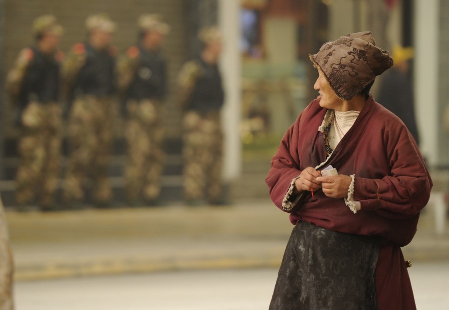Read moreAn Ethnic Tibetan woman stands on a street as armed Chinese PLA soldiers keep watch in Chengdu in southwest China's Sichuan province, on January 27, 2012. The Tibetan-inhabited region of West Sichuan appeared to be under lockdown after it was rocked by deadly clashes, as exile groups gave grisly details of how the unrest unfolded. #