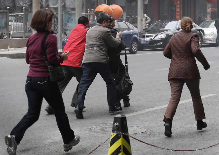 Read morePlainclothes police officers detain Liu Xiaobai for placing a white jasmine flower on a planter in front of a McDonald's restaurant that was a planned protest site in Beijing, China, on February 20, 2011. Jittery Chinese authorities had staged a concerted show of force to squelch a mysterious online call for a "Jasmine Revolution" apparently modeled after pro-democracy demonstrations sweeping the Middle East. #