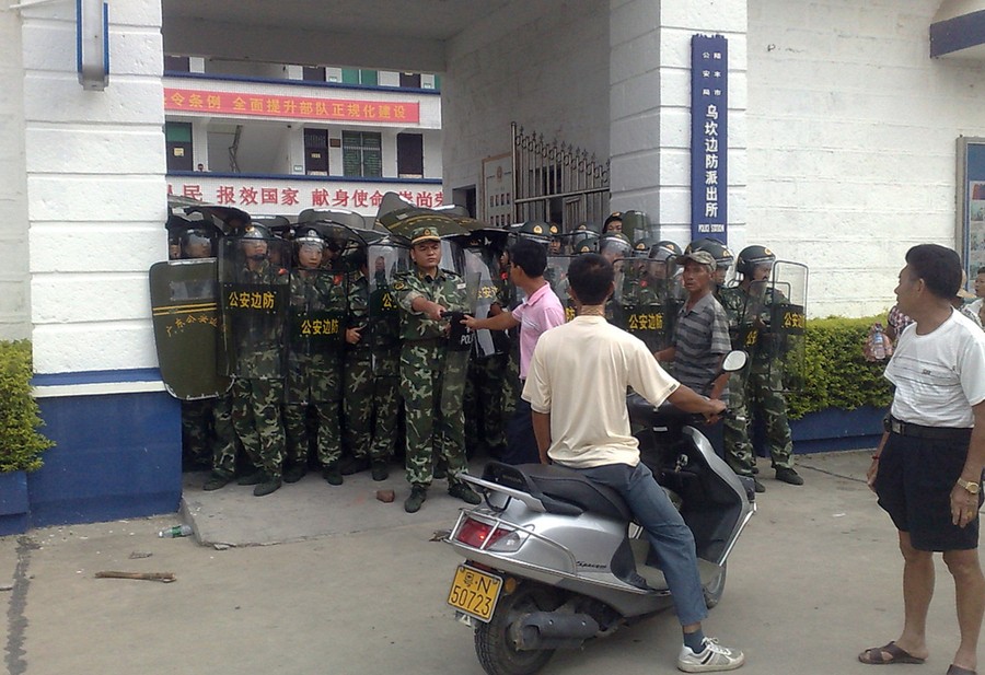 Read moreRiot police order people to move at the entrance to the Zhili town government building in Huzhou city, Zhejiang province, on October 27, 2011. Hundreds of people clashed with police and smashed public property after a dispute between tax authorities and a local shop owner snowballed into protests. #