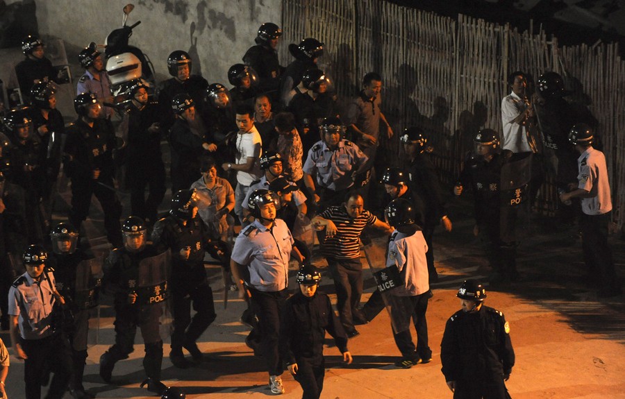 Read moreRiot policemen remove protesters outside the entrance of a factory of Zhejiang Jinko Solar Co. Ltd. in Haining, Zhejiang province, on September 17, 2011. Hundreds of villagers in east China's Zhejiang Province protested for days at the solar panel manufacturer, which is a subsidiary of a New York-listed firm, over concerns about its harmful wastes, Xinhua News Agency reported. #