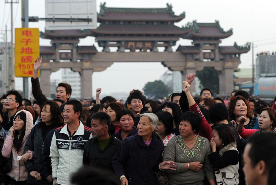 Read moreThis photo taken on June 12, 2011 shows hundreds of residents gathering along the main road in Xintang town, a denim garment district in southern China's Guangzhou province. Hundreds of people rioted in southern China over the weekend, with the major city of Guangzhou hit by mass protests after rumors spread on the Internet that police beat a street hawker to death. #