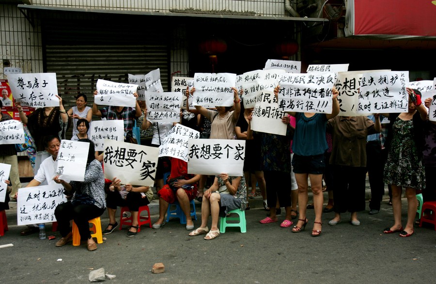 Read moreChinese villagers hold placards reading "I want a home" and "firmly resist illegal demolition" as they protest against low compensations following land seizure disputes with local government and a property developer in Beixin village, in Wuhan, central China's Hubei province, on July 14, 2011. #