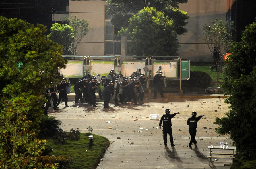 Read moreRiot policemen shield themselves from rocks thrown by protesters they approach the entrance of a factory of Zhejiang Jinko Solar Co. Ltd. in Haining, Zhejiang province, on September 17, 2011, after days of protests directed toward the solar panel manufacturer, over concerns about its harmful wastes, Xinhua News Agency reported. #