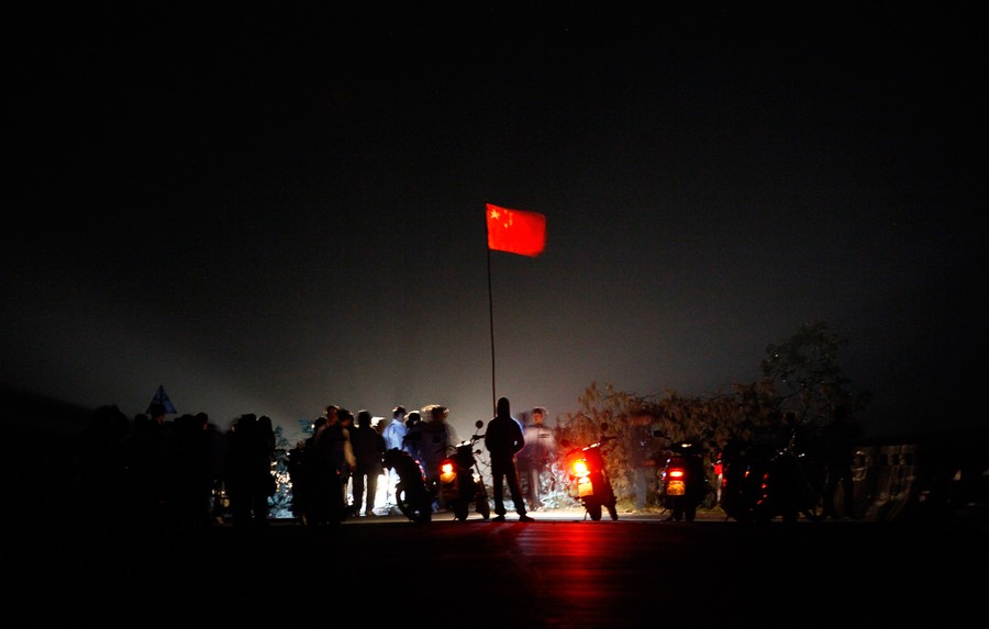 Read moreThe Chinese national flag flies from a makeshift mast as residents of the village of Wukan in Lufeng county, Guangdong province, remove a barricade blocking a bridge leading into the village, on December 20, 2011. For a week, the semi-urban village of Wukan in Guangdong province has driven off officials and police, and held daily protests attracting thousands of residents outraged by the death in custody of local man Xue Jinbo. A village leader in the besieged village has told hundreds of residents at a rally on Monday to participate in a protest march on Wednesday to deliver a petition the local government. #