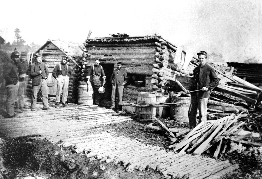 Read moreServing as a soldier in uniform and getting regular army pay, a former slave (center, with hands in pockets) stands with other Federal soldiers at the Army of the Potomac winter headquarters near Fredericksburg, Virginia, The log hut served as a mess house for the regiment. #
