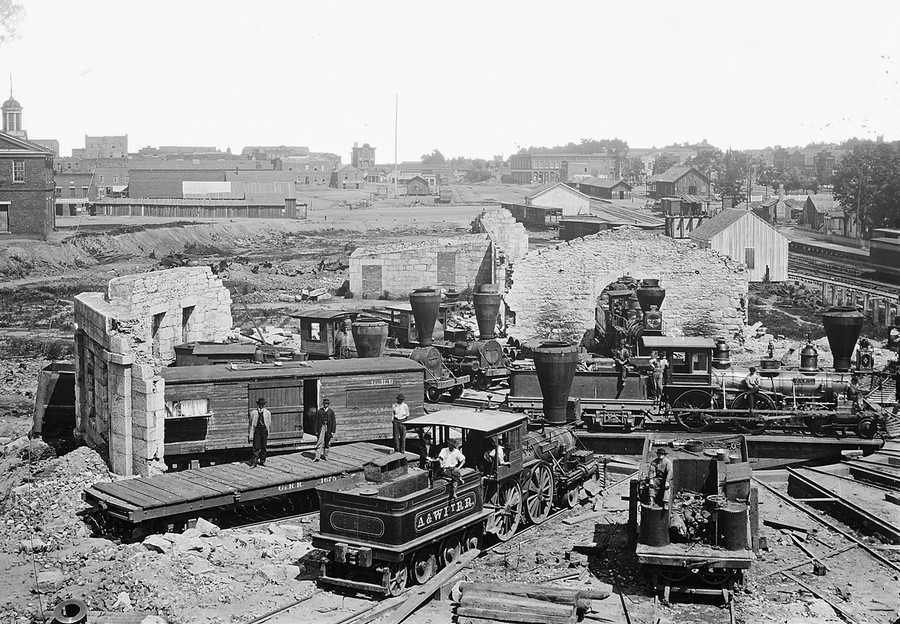 Read moreIn Atlanta, Georgia, soldiers sit atop boxcars at a railroad depot. At right is the office of Atlanta's Daily Intelligencer newspaper. Panorama made from two photographs taken by George N. Barnard in 1864. #
