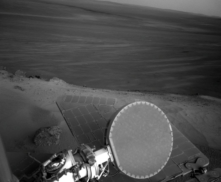 Read moreIn the foreground, the high-gain antenna aboard NASA's Rover Opportunity, as the robotic probe has positioned itself on the rim of Endeavour Crater with an approximate 15-degree northerly tilt for favorable solar energy production during the Martian winter. While positioned for the winter, Opportunity is conducting regular radio Doppler tracking measurements to support geo-dynamic investigations of the planet. #