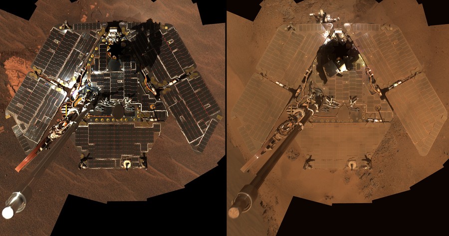Read moreWhat eight dusty years on Mars will do to a rover. This pair of self-portaits from NASA's Mars Exploration Rover Opportunity shows dust accumulation on the rover's solar panels as the mission approaches its fifth Martian winter. The dust reduces the rover's power supply, and the rover's mobility is limited until the winter is over or wind cleans the panels. The photo on the left side was taken in February of 2005, when Opportunity had only been on the planet for 322 Martian days (sols). The right side was taken in December of 2011, after some 2,800 sols. Total distance driven by Opportunity to date: 34.36 km #