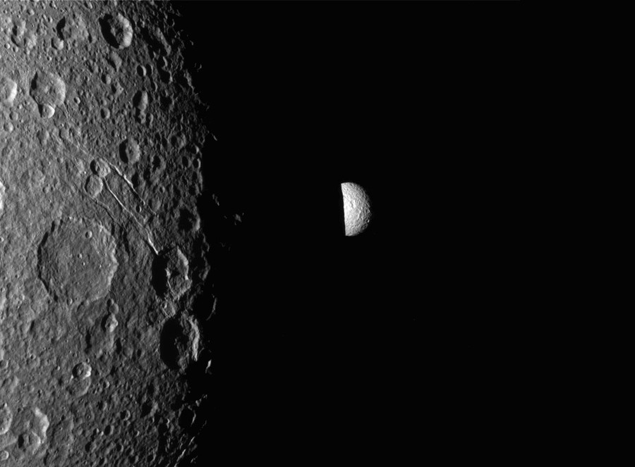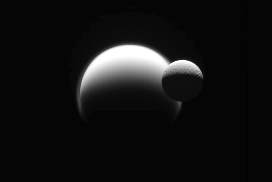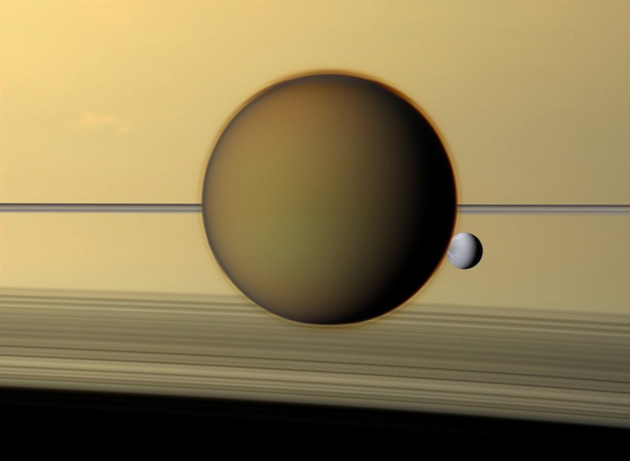 Read moreSaturn's fourth-largest moon, Dione, can be seen through the haze of the planet's largest moon, Titan, in this color view of the two posing before the planet and its rings from NASA's Cassini spacecraft. #