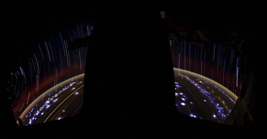 Read moreStar trails captured from the ISS by Astronaut Ron Pettit. A long-exposure photograph of Earth's night side below, showing Airglow in the atmosphere, multiple lightning strikes, and streaks from city lights - as well as the star trails above. #