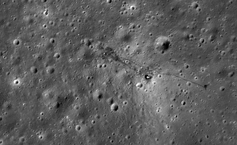 Read moreOn the Moon, the Apollo 15 landing site, imaged from an altitude of 25 km by NASA's Lunar Reconnaissance Orbiter on November 6, 2011. Apollo 15 was the ninth manned mission in the Apollo space program, and the fourth to land on the Moon on July 30, 1971. Commander David Scott and Lunar Module Pilot James Irwin spent three days on the Moon, including lots of time in LRV-1, the first Lunar Rover, which they drove across 17.25 miles (27.76 km) of lunar surface. In this image, the descent stage of Apollo 15 is just right of center, the white spot with a surrounding shadow. Dark tracks to the right lead to the LRV-1, left parked on the moon. The trail of astronaut footprints at center-left surround the ALSEP experiments package. If you look closely at the left edge, you can see rover tracks leading off toward Hadley Rille, some 2km beyond. #