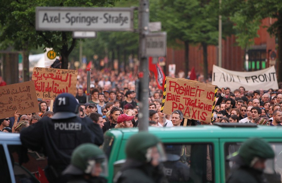 Read moreRiot police watch as left-wing demonstrators march past Axel Springer headquarters during a May Day anti-capitalism protest on May 1, 2012 in Berlin, Germany. This year marks 25 years since a 1987 Berlin May Day demonstration turned violent and has been followed by clashes between participants and police on May Day in Berlin almost every year since in what has become an annual ritual. #