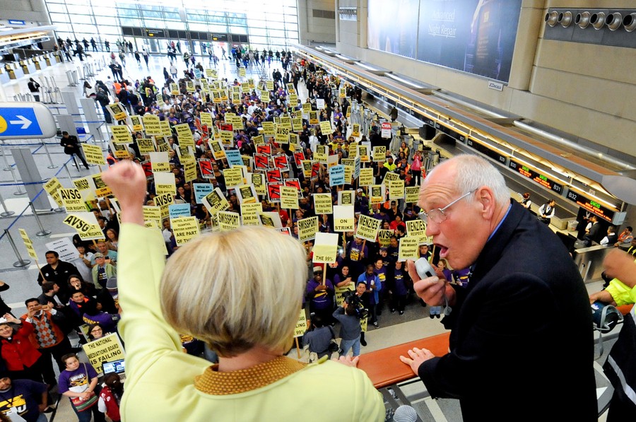 Read moreLos Angeles Councilman Bill Rosendahl (right) and Representative Janice Hahn (left) address members of the Service Employees International Union (SEIU) United Service Workers West labor union and their supporters during a protest on an one-day general strike at Los Angeles International Airport in Los Angeles, California May 1, 2012. Approximately 1,200 protesters took part in the demonstration to protest working conditions and to lend support to other May Day rallies. #