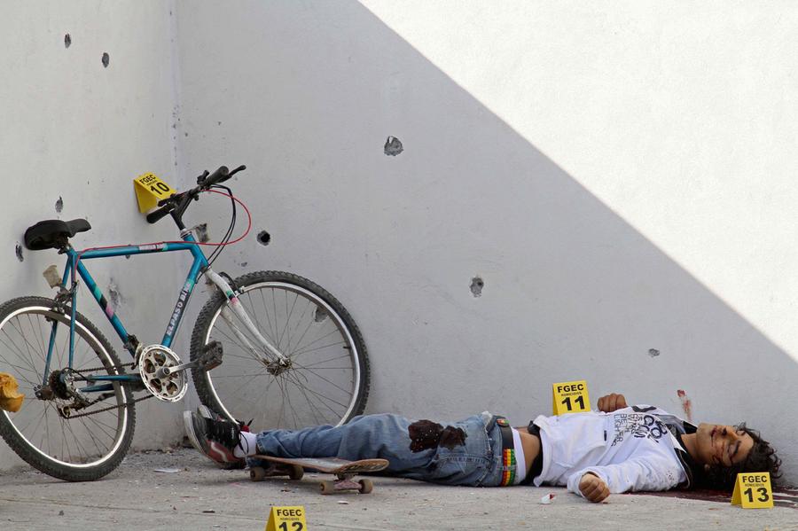 Read moreA young man lies dead next to a skateboard and a bicycle after unknown gunmen opened fire in the eastern part of Saltillo, Mexico, on December 7, 2011. According to the state attorney general, three young men were killed in the attack. #
