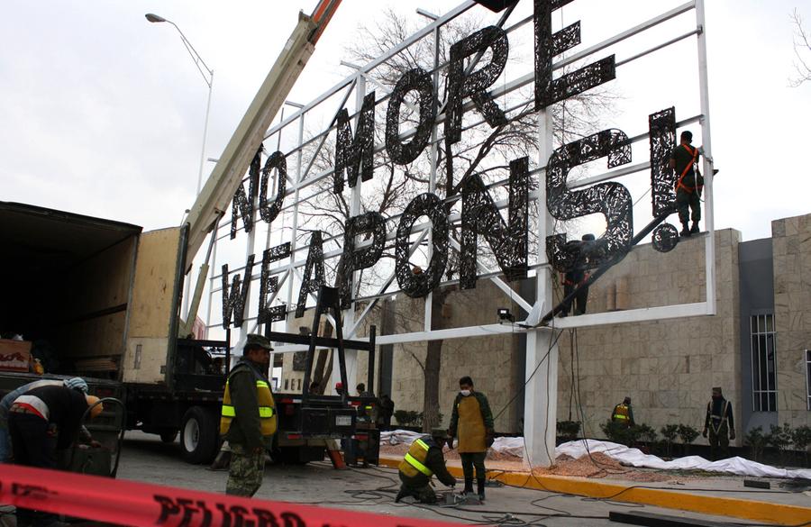 Read moreSoldiers put the final touches on a giant "No More Weapons" billboard composed of crushed firearms, placed near the U.S. border in Ciudad Juarez, Mexico, on February 17, 2012. President Felipe Calderon unveiled the billboard Thursday and urged the United States to stop the flow of weapons into Mexico. #
