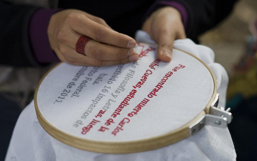 Read moreWorking on a scarf, a woman embroiders the account of a murder in a park in Mexico City, on November 13, 2011. The "Red Fountains" civil movement proposes the "Embroidery for Peace, a scarf, a victim" action for each of the victims of violence in Mexico. #