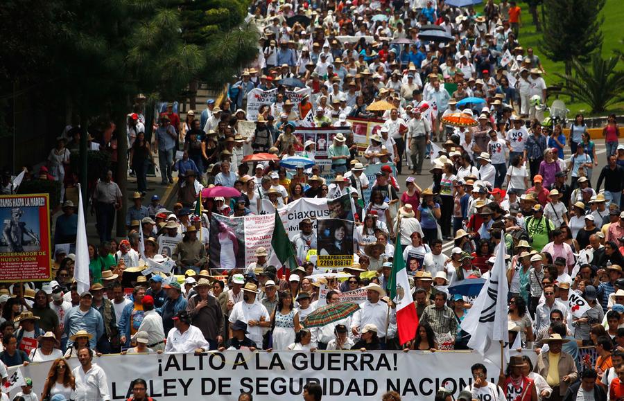 Read moreDemonstrators march to protest against violence in Mexico City, on August 14, 2011. The continuing tide of drug-related killings in Mexico has drawn thousands of protesters to march against violence. The sign reads in Spanish: "Stop the war. No to the National Security Law". #