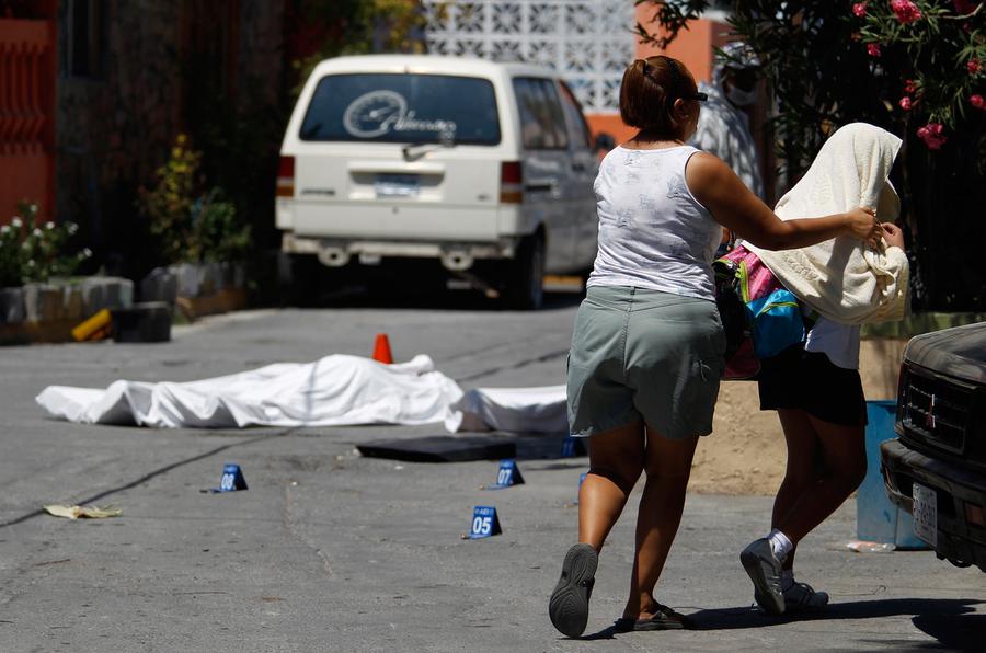 Read moreA woman covers her daughter with a towel as they walk past a crime scene in the municipality of San Nicolas de los Garza, neighboring Monterrey, on September 14, 2011. Six men were gunned down by unknown assailants in separate incidents in this municipality, local media reported. #