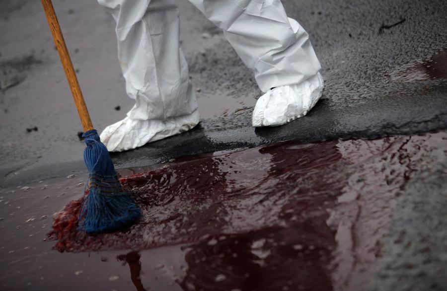 Read moreA forensic technician sweeps blood off a street at a crime scene in Monterrey, on February 8, 2012. A taxi driver was shot dead by gunmen as another group of hitmen attacked three taxi drivers in a different neighborhood, killing two and injuring one, according to local media. #