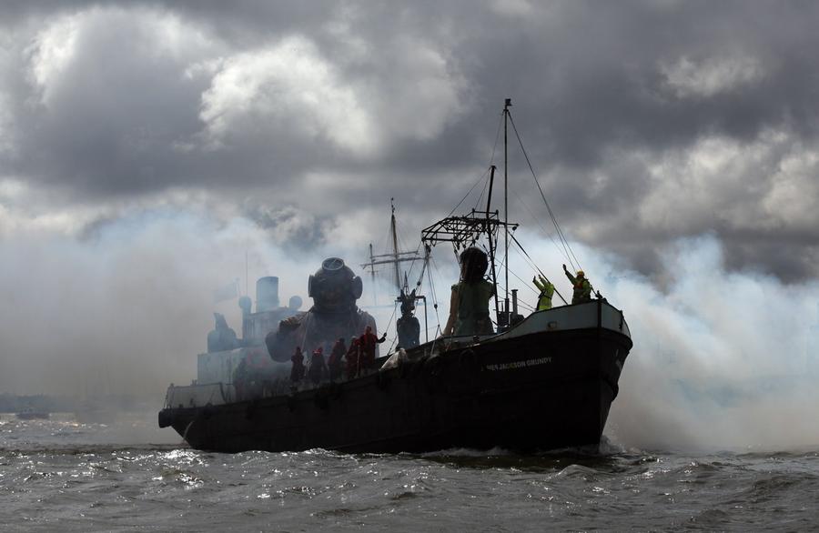 Read moreIn the finale of the Sea Odyssey, the giant deep sea diver, the little giant girl and her dog Xolo sail along the River Mersey through pyrotechnic smoke watched by thousands of people on April 22, 2012 in Liverpool, England. Over the last three days French street theatre company Royal De Luxe performed Sea Odyssey with the giants coming to life telling a love story inspired by a letter written by a young girl to her father who worked as a steward on the Titanic. #