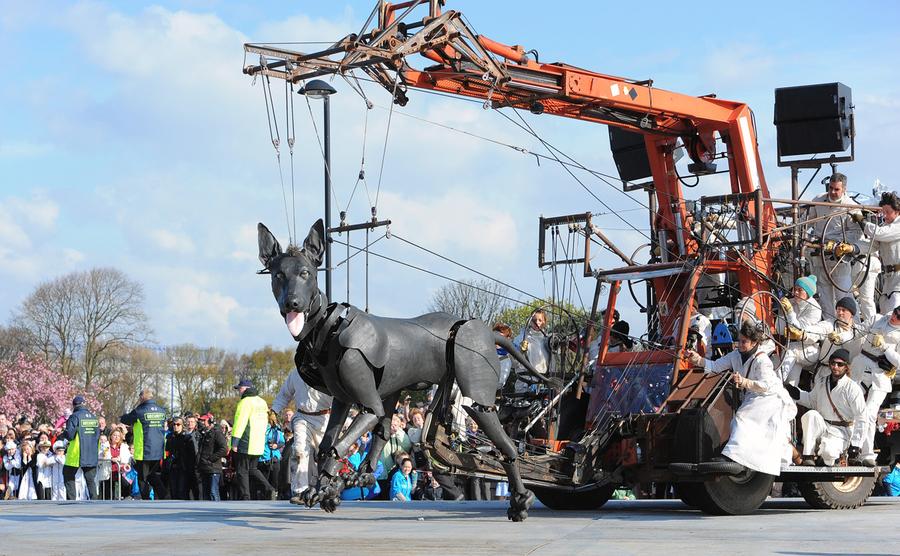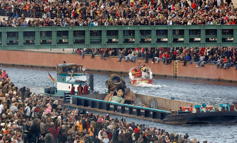 Based in Nantes, France, the street theatre company Royal de Luxe performs around the world, primarily using gigantic, elaborate marionettes to tell stories that take place over several days and wind through entire cities. Puppeteers maneuver the huge marionettes -- some as tall as 12 meters (40 ft) -- through streets, parks, and waterways, performing their story along the way. Gathered here are images of several recent Royal de Luxe performances, from Belgium, Mexico, Germany, Chile, and England.