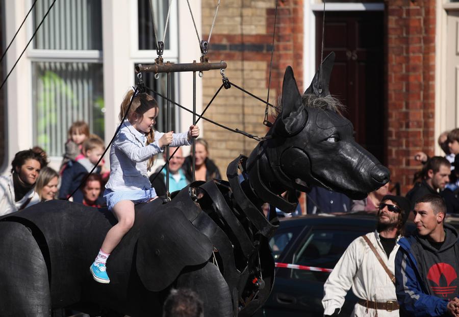 Read moreA little girl rides the giant pet dog of the Little Girl Giant marionette as it makes its way through the streets of Liverpool during the Titanic Sea Odyssey puppet spectacular on April 20, 2012 in Liverpool. #