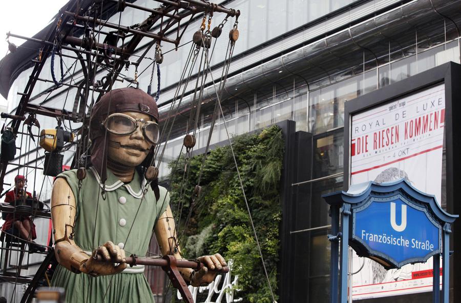 Read moreWearing an aviator's cap and goggles, the Little Giantess of the French theatre company Royal de Luxe makes her way down Berlin's Friedrichstrasse past Franzoesische Strasse subway station on October 2, 2009. #