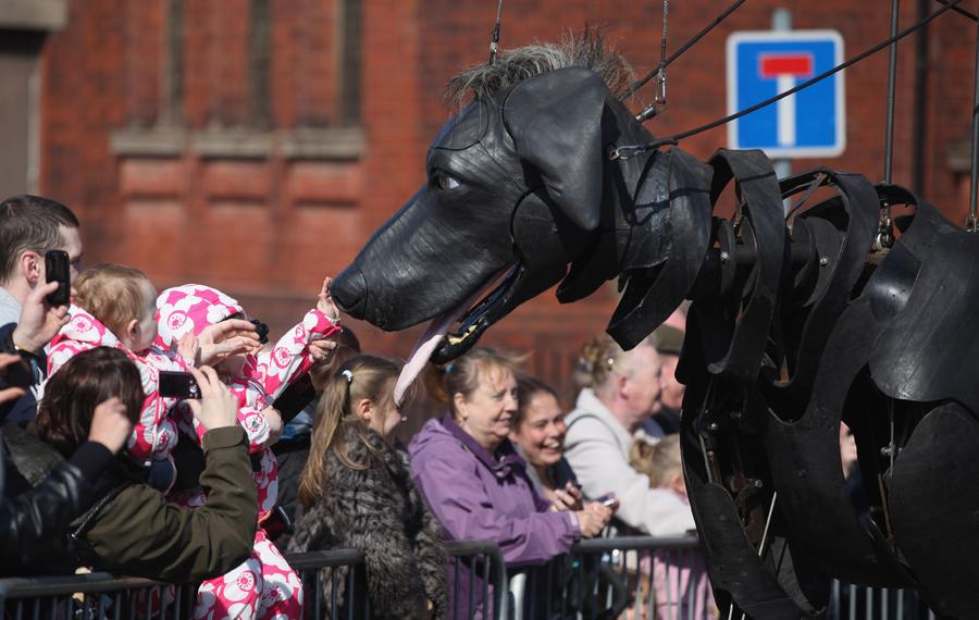 Read moreA little girl pats the giant pet dog of the Little Girl Giant Marionette as it makes its way through the streets of Liverpool during the Titanic Sea Odyssey puppet spectacular on April 20, 2012. #