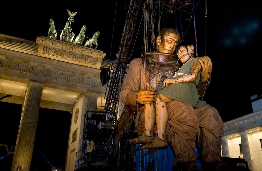 Read moreA giant marionette, operated by performers, walks in Berlin, Germany, on October 2, 2009. The French marionette street theatre company Royal de Luxe gave open air performances around the Day of German Unity in Berlin. The artists used the giant puppets to tell the story of separation and recovery to commemorate the fall of Berlin Wall 20 years earlier. #