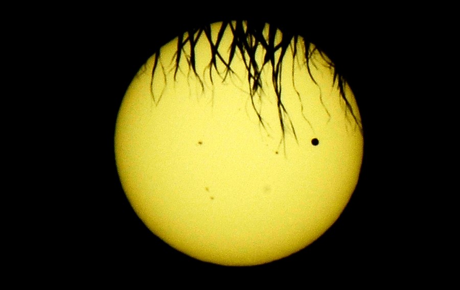 Observers around the world (at least those who who were blessed with clear skies) were able to look up yesterday and view our neighboring planet Venus as it passed directly between us and the Sun. This rare event will not reoccur for another 105 years. Scientists used the six-hour transit as an opportunity to perform experiments, helping refine techniques to observe and measure distant exoplanets. Gathered here are images of yesterday's event, seen from from orbit and from here on Earth.