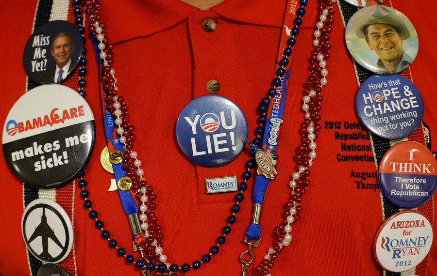 Read moreDelegate Debra Jean Forrest of Mesa, Arizona, wears an autographed button showing Arizona Governor Ban Brewer arguing with President Barack Obama, during the Republican National Convention, on August 28, 2012. #