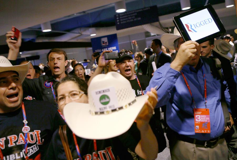 Read moreTexas delegates and Ron Paul supporters walk out of the Republican National Convention, on August 29, 2012. Paul's supporters were protesting a move made by party officials that stripped away half of Ron Paul's delegates. #