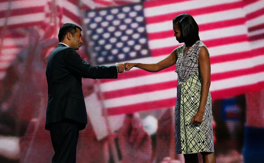 Read moreU.S. first lady Michelle Obama fist-bumps actor and Obama administration official Kal Penn, the associate director of the White House Office of Public Engagement, as she tours the stage a day before her speech to the Democratic National Convention in Charlotte, North Carolina, on September 3, 2012. #